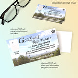 Our 14 pt. card stock is a popular option for affordable business cards. We will apply a high gloss coating to the color sides of your business card.