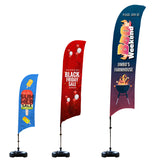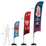 Flags include a pocket for pole insertion and grommets on the bottom so the short bungee cord can hook on and attach the graphic to the base.
